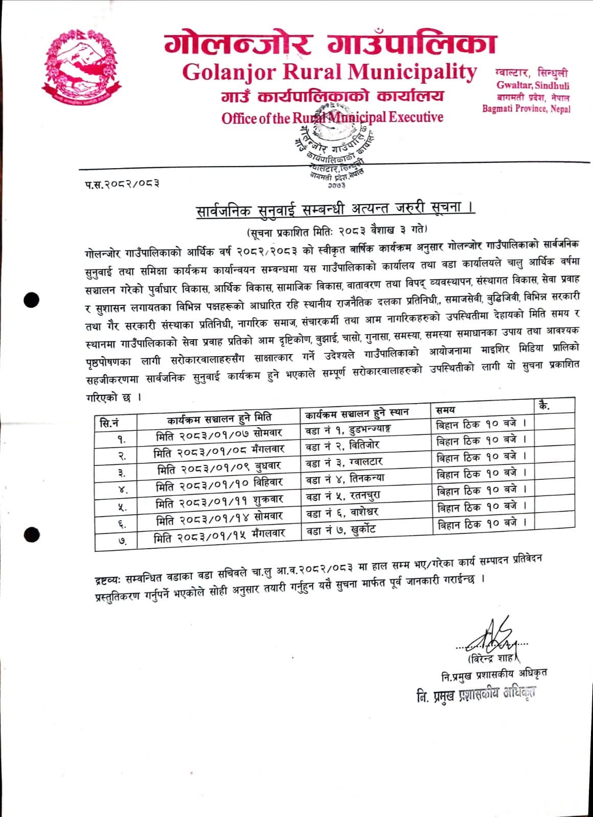 गोलन्जोर गाउँपालिकाले सार्वजनिक सुनुवाइ कार्यक्रम सञ्चालन गर्ने भएको छ। गाउँपालिकाले एक सूचना जारी गर्दै आर्थिक वर्ष २०८१/०८२ को स्वीकृत वार्षिक कार्यक्रमअनुसार सेवा प्रवाह, विकास गतिविधि तथा समग्र कार्यसम्पादनबारे नागरिकसँग प्रत्यक्ष अन्तरक्रिया गर्न सार्वजनिक सुनुवाइ आयोजना गर्न लागेको जनाएको हो।